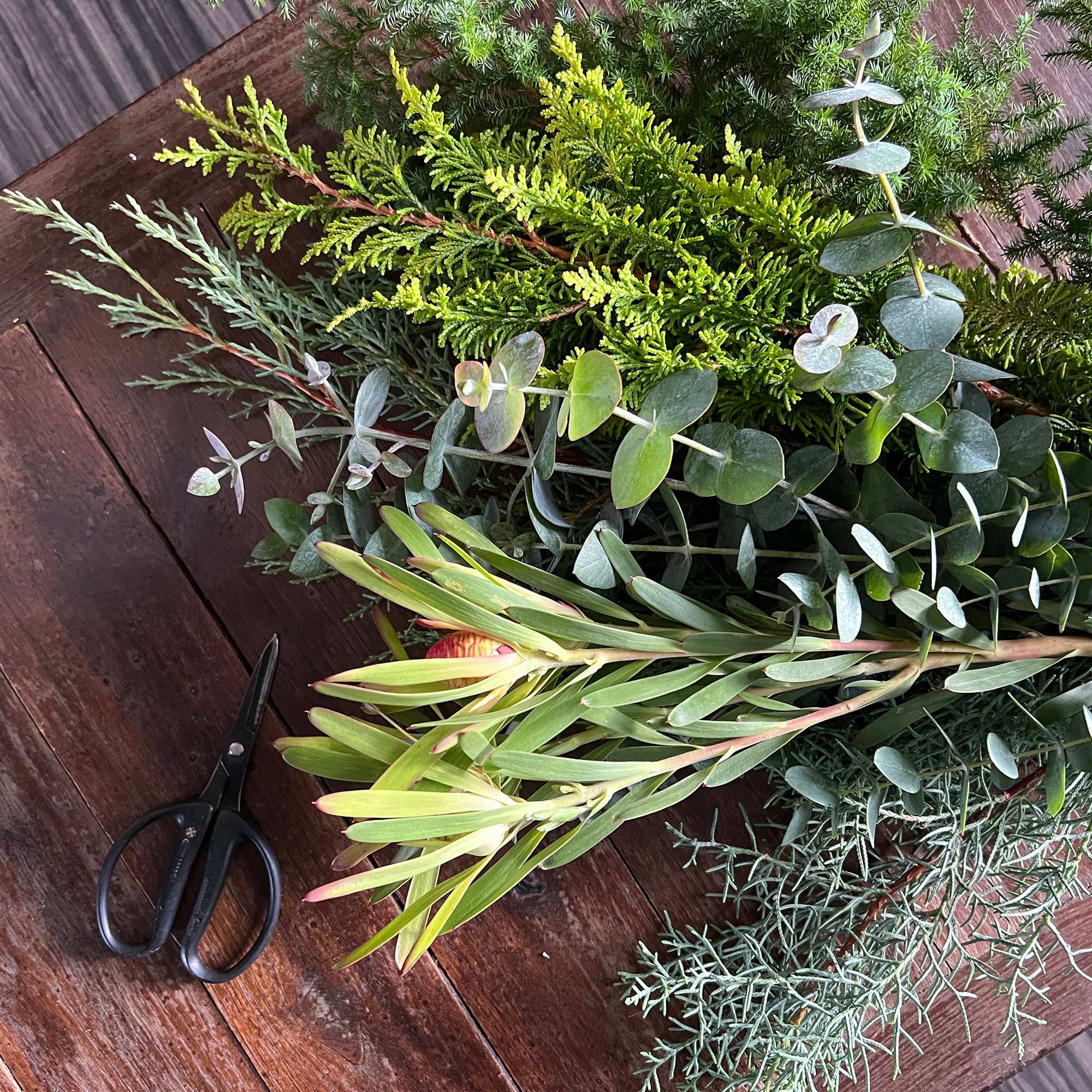 森の中から針葉樹をセレクトして持ち帰り、その年のリースやスワッグをつくりました。
