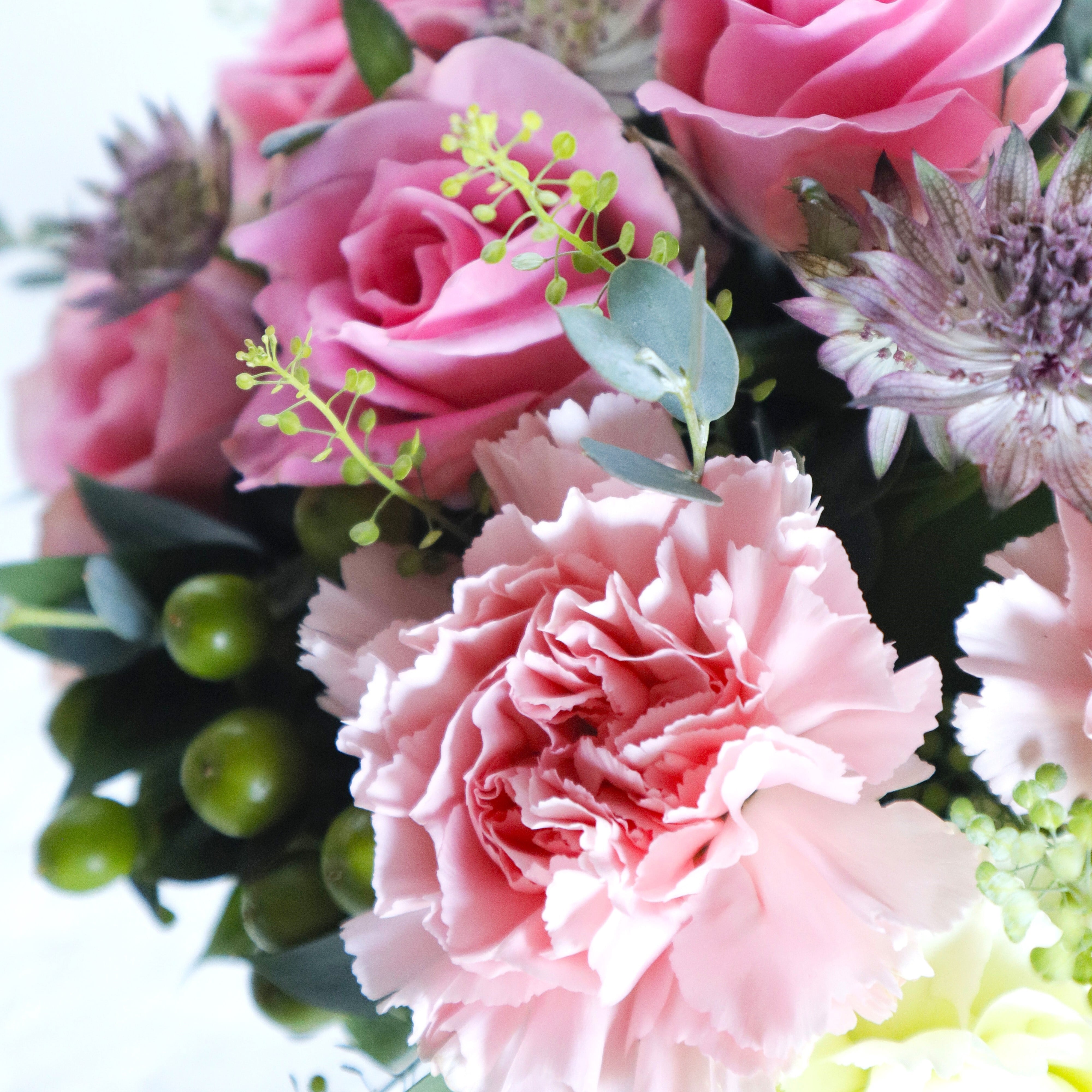 人気色、ピンクのバラと柔らかな季節のお花やグリーンが入った