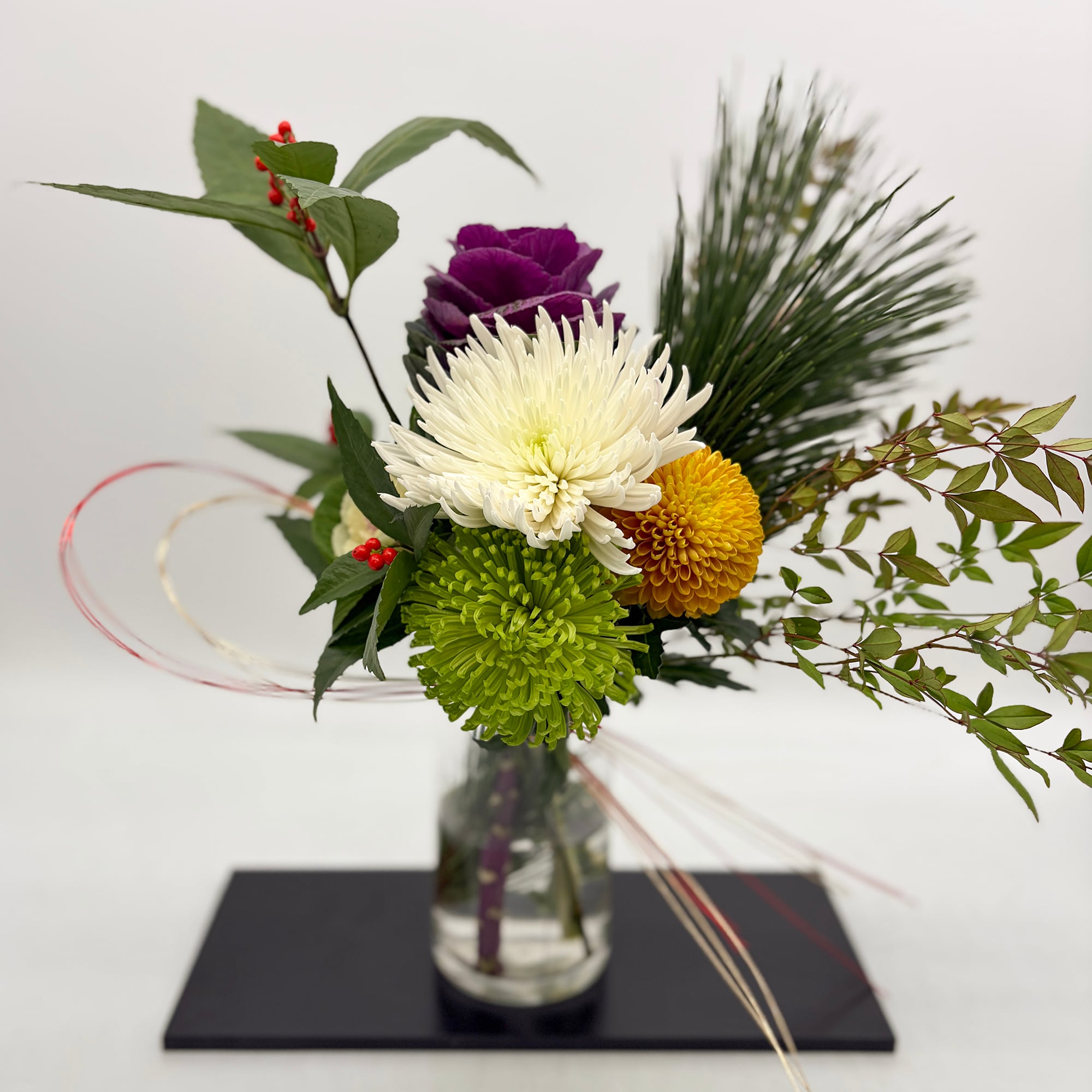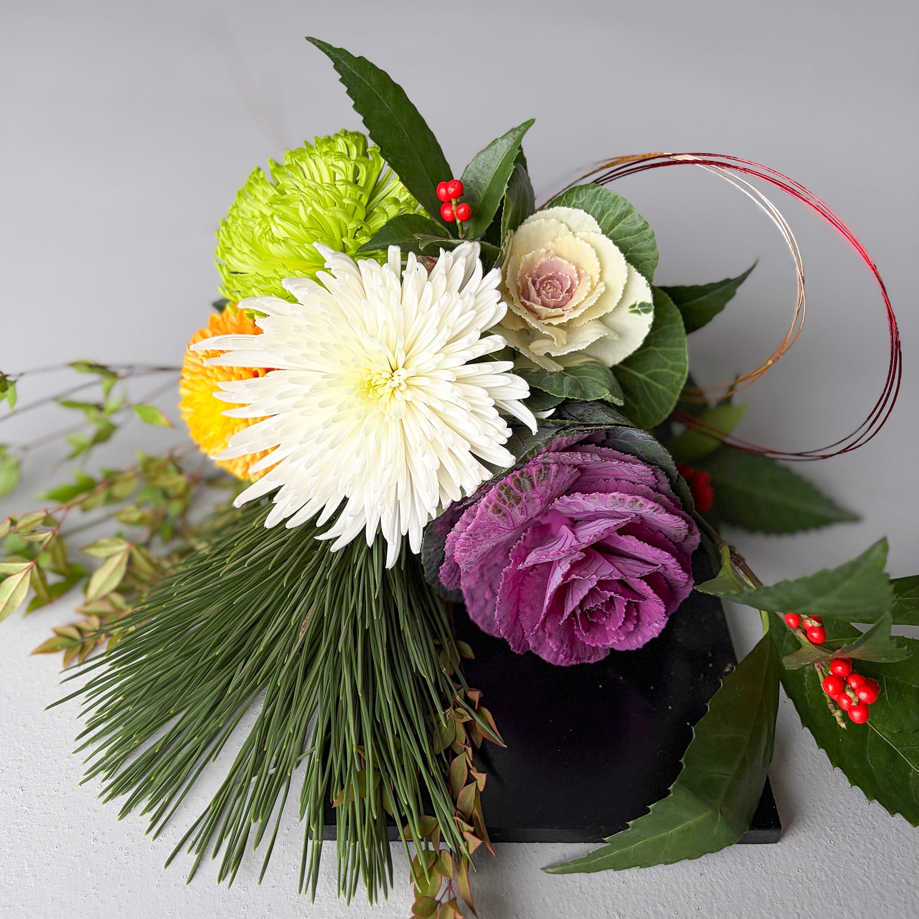 福を呼ぶとされる縁起の良い植物に、存在感のある菊を束ねて。
