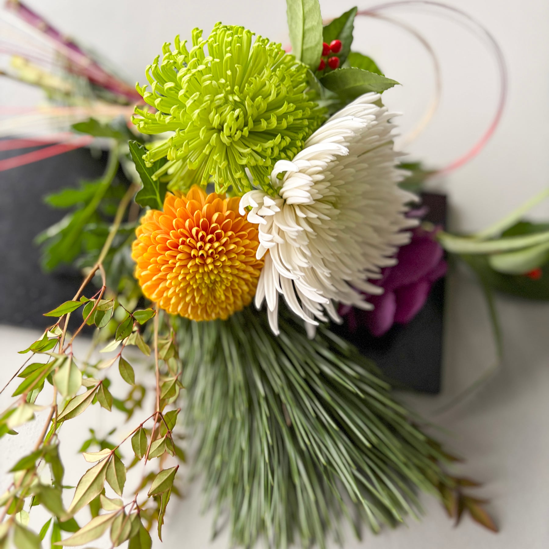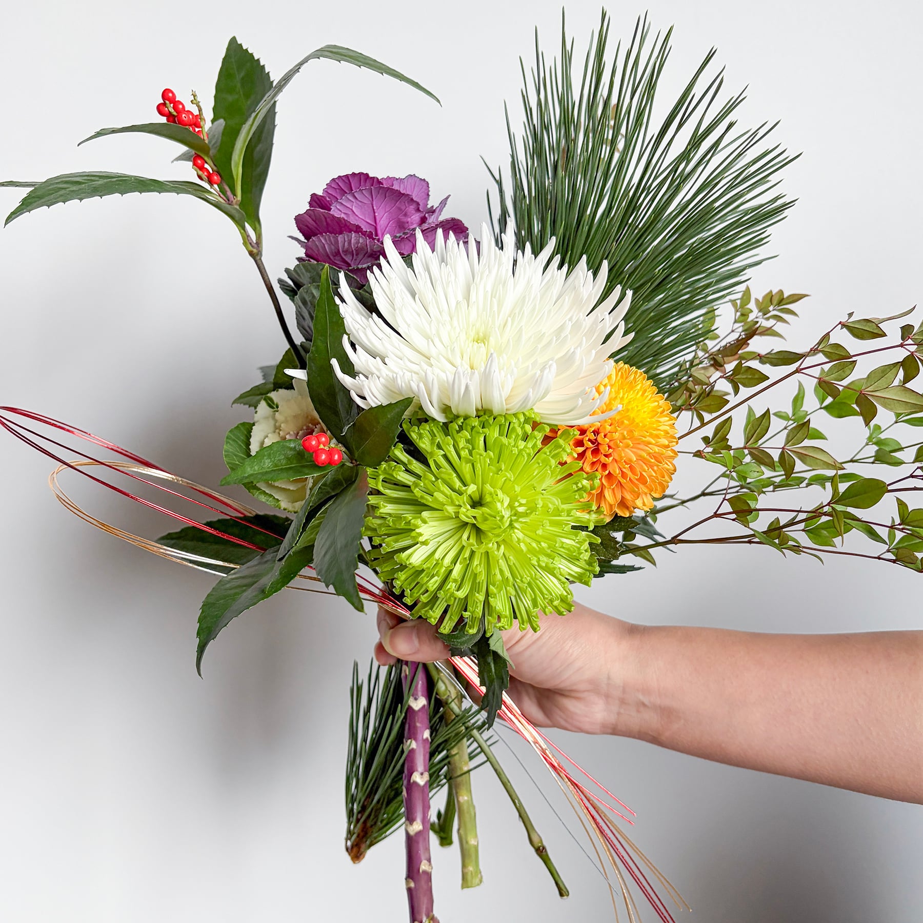 小さめですが、華やかで、お正月の空間を彩るのにぴったりなブーケとなりました。