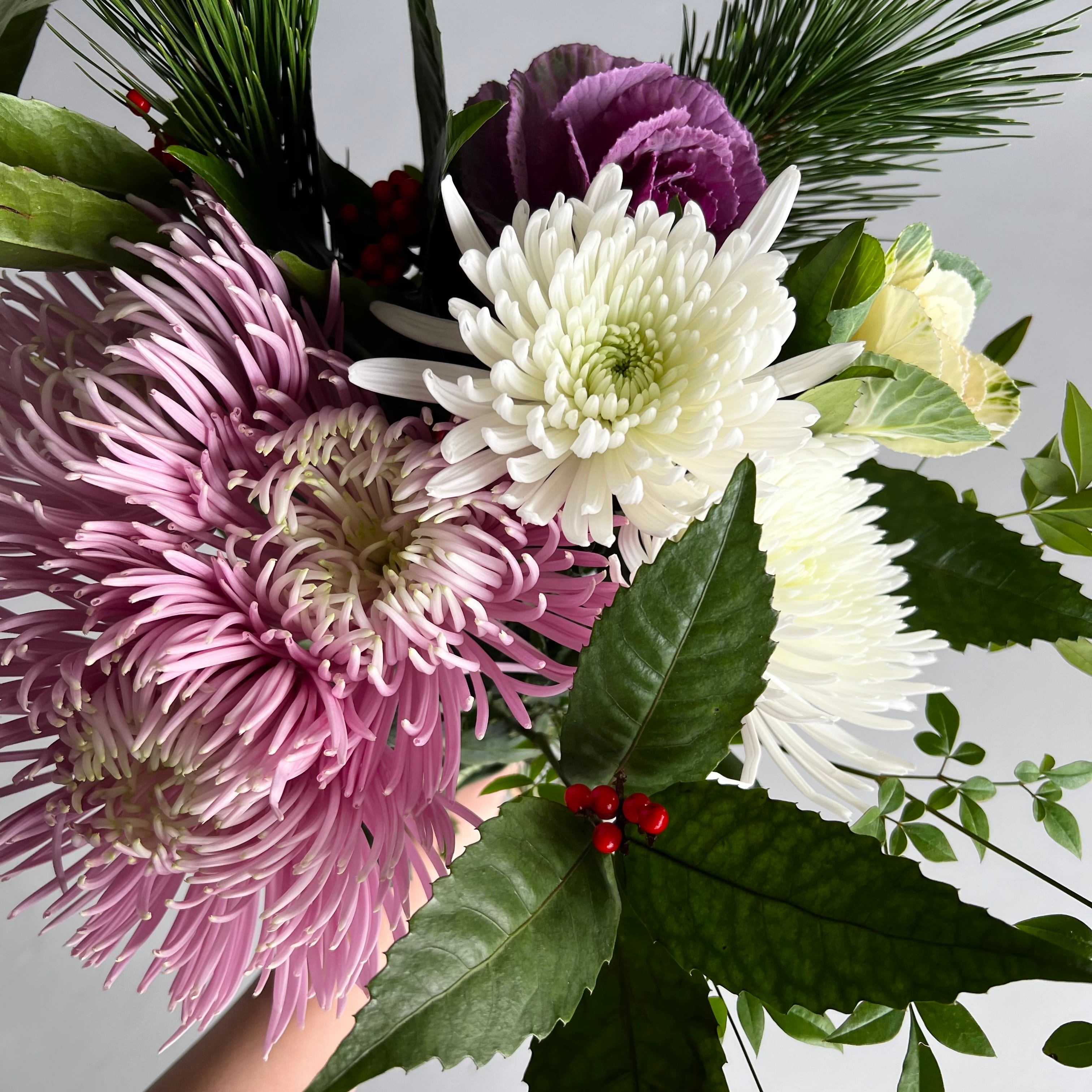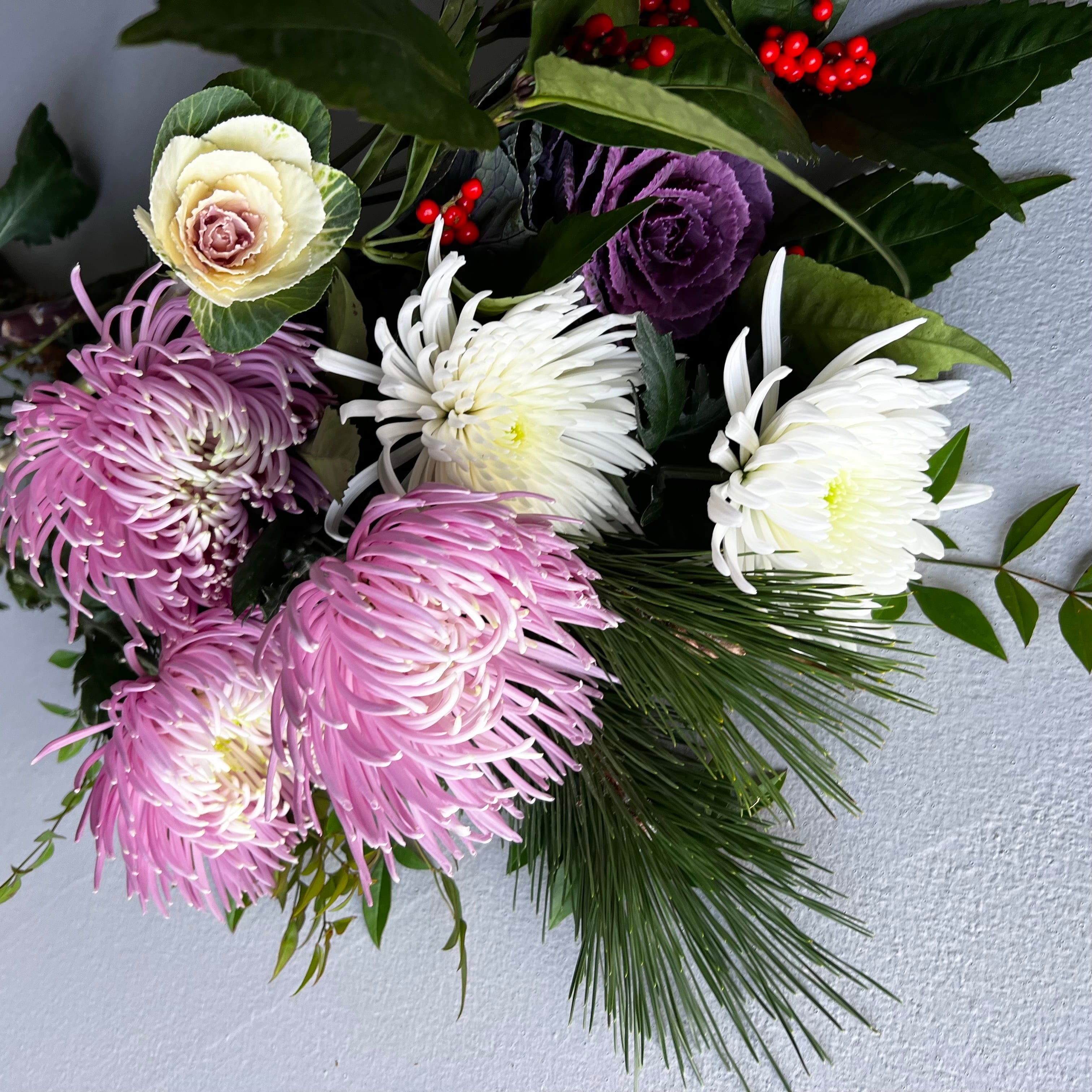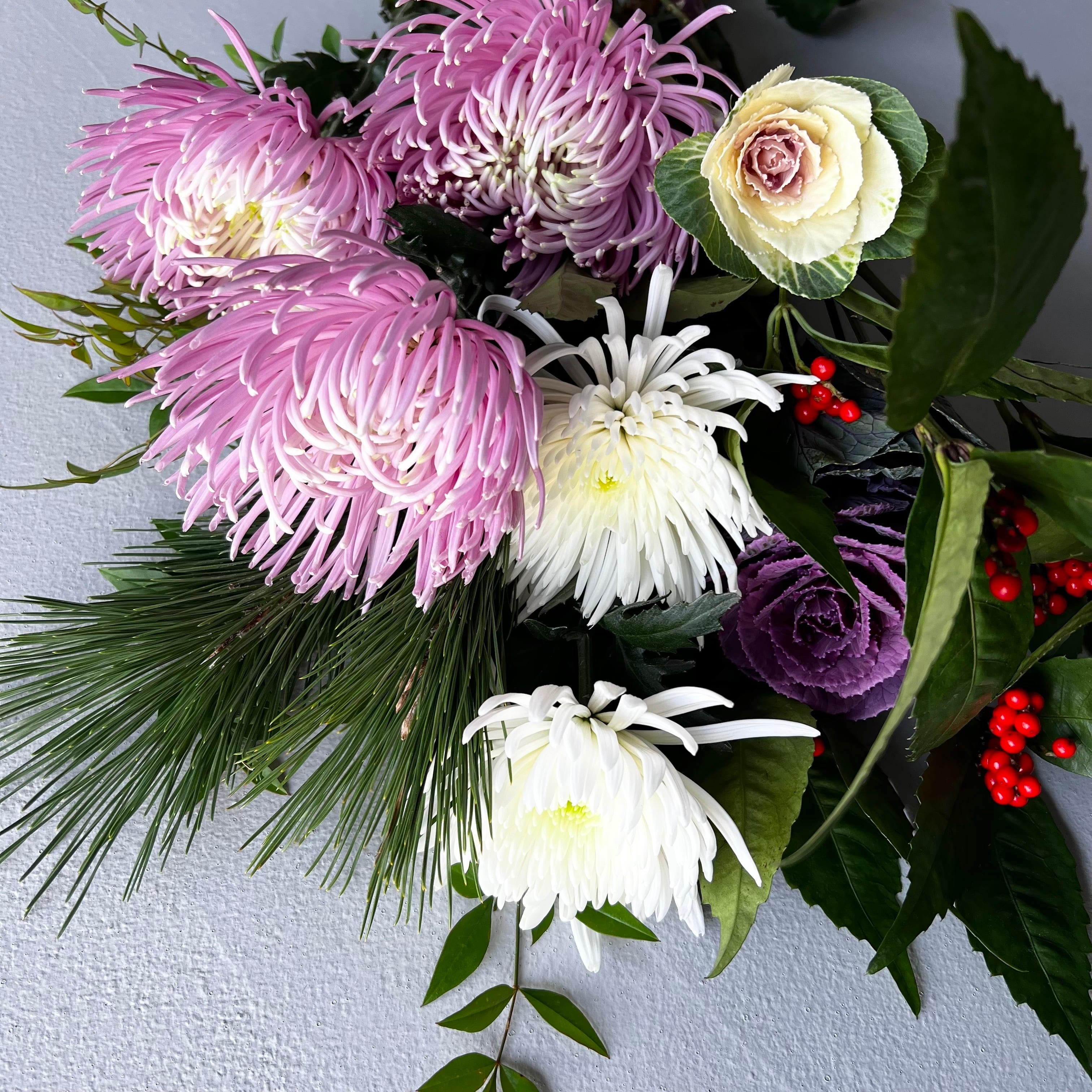 紅白の葉ボタンに、華やかな紅白のマム。