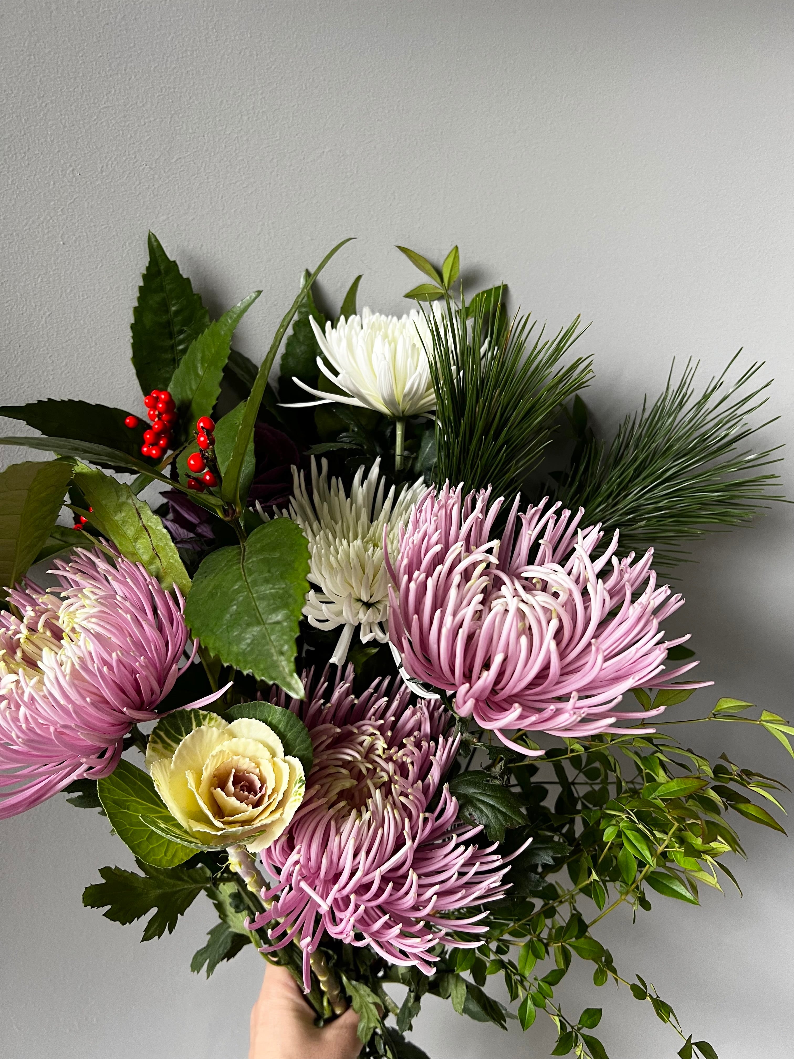 菊の端正な花姿で、新年らしい華やかさと凛とした印象にまとまりました。
